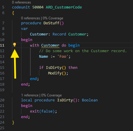 It can be a daunting task to fix all the “With” statements in a project. The Business Central team has provided a Code Action in Visual Studio Code to help. Run code action for ‘with’ for file, project, or workspace | Microsoft Learn