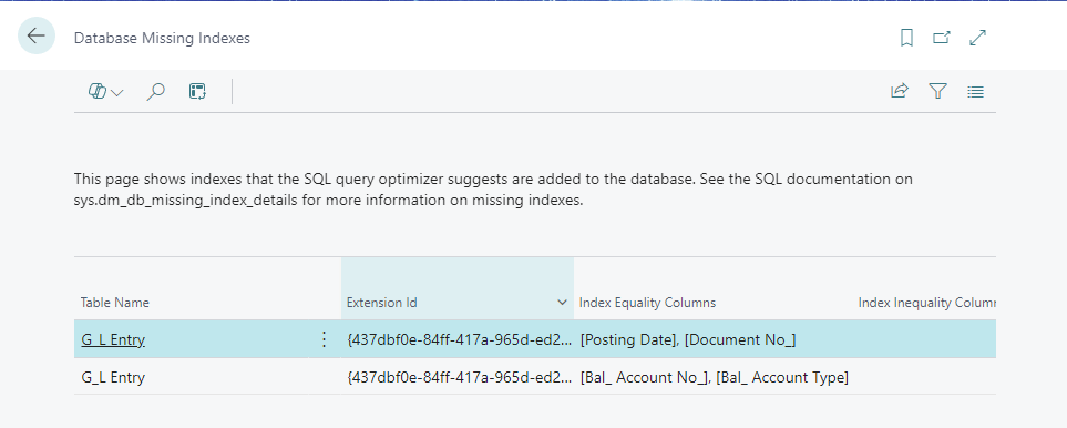In this case we can see it is suggesting that I add two indexes to the GL Entry table. This BC implementation has several reports that leverage the Posting Date and Document No. as well as another process that looks at the Balance Account No. and the Balance Account Type. Adding these indexes would greatly speed up those functions.