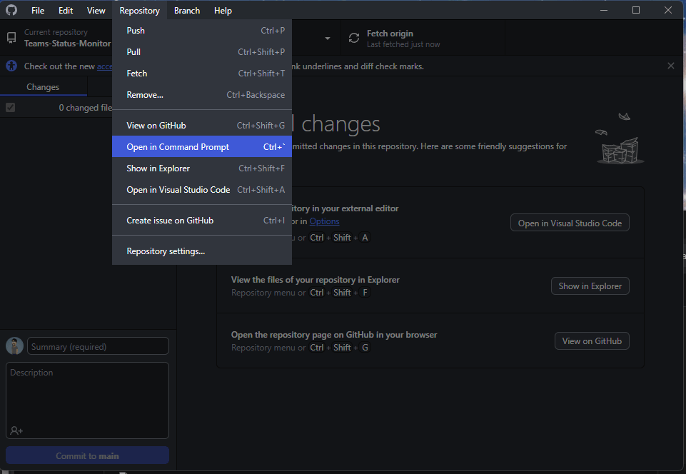 Here is the process to clear the commit history. Start by opening GitHub Desktop and opening a command prompt.