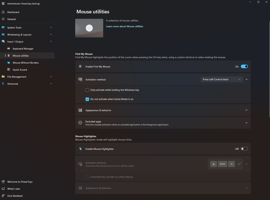Find My Mouse: Double click the Left CTRL button and the screen dims and the mouse pointer is circled. I use several screens, I’m old, and I lose the mouse pointer.