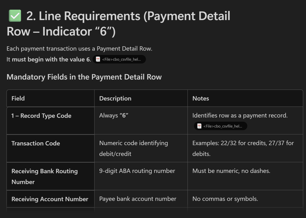 For this process I’m going to utilize the ACH Payments CSV File Upload Reference Guide for Chase. This file isn’t overly complex, but the documentation is freely available. Most of my requirement’s documents are marked confidential.