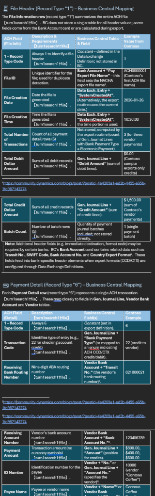 I can now ask Copilot questions about the file. “Review the attached documentation and outline the field requirements for the header and line definitions for a business central data export.”