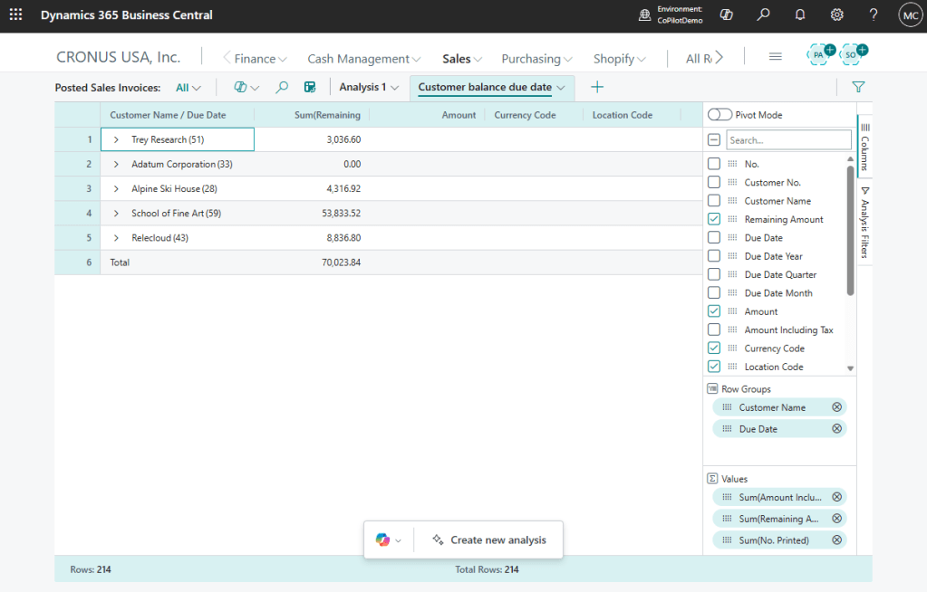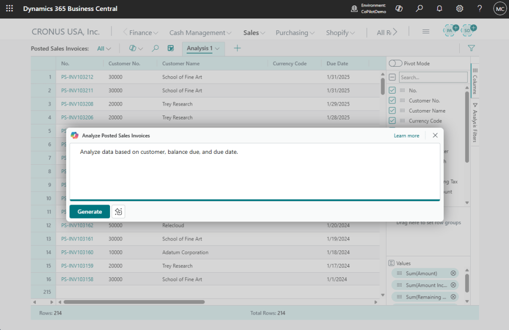 Let’s start with creating an Analysis View. I’m going to go to the Posted Sales Invoices list and click the Analysis View and use CoPilot to generate a view.