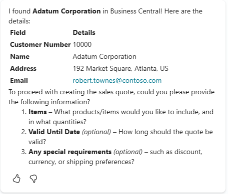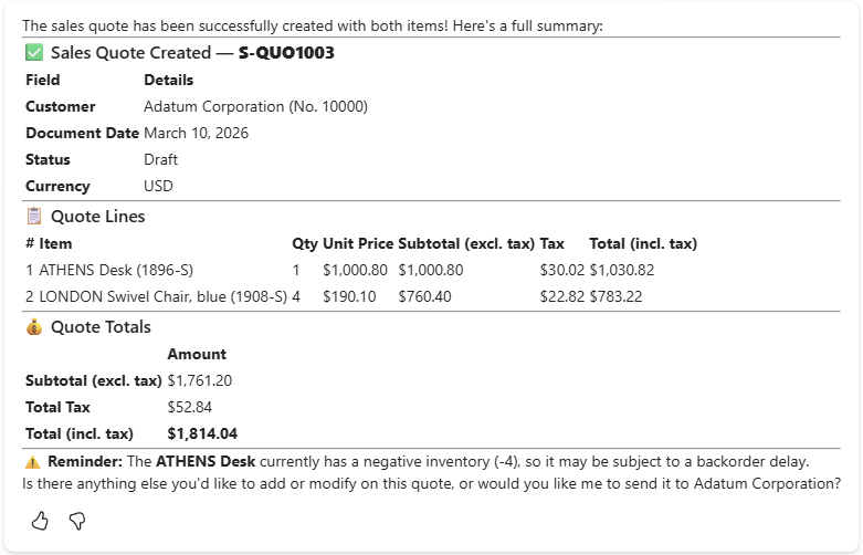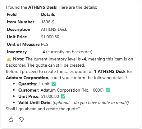 I started with “I would like to make a new sales quote for Adatum Corporation.” and the system responds: