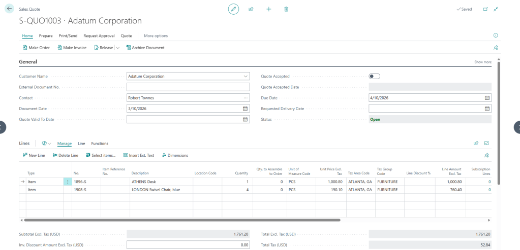 When we hop back into Business Central, we can find the quote, and it matches what we see in Copilot Studio.