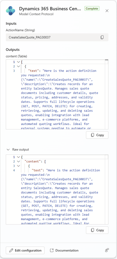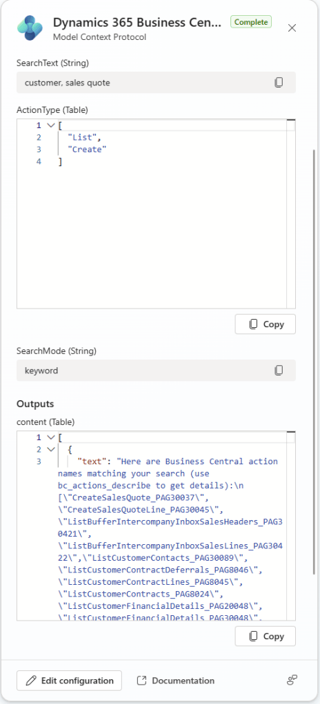We can see in the Agent Tasks as it works through the request. In this image it identified that I’m going to need Customers and Sales Quote and polls the MCP for those details.