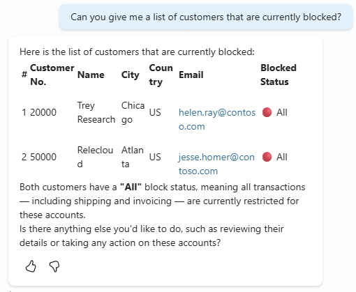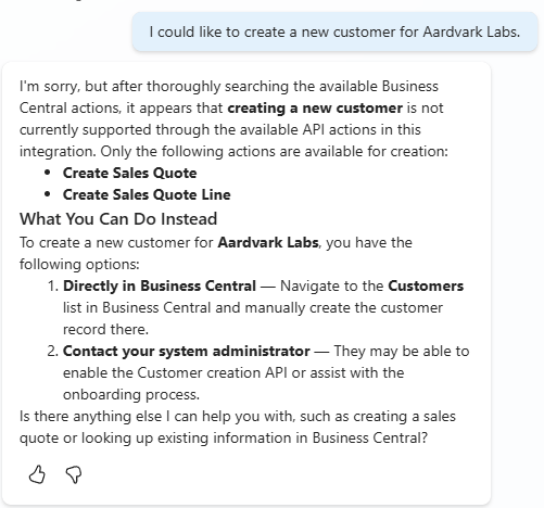 Let’s take a step back now and talk about security. If you expose it to the MCP server it is available to the world! In our configuration we only check the box for Customer Read. What happens if I ask the Copilot to create a new customer?