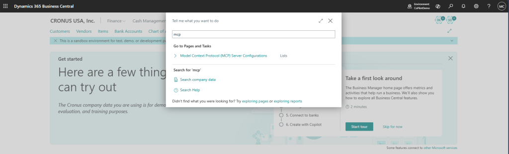 In Business Central use the “Tell me magnifying glass” and enter “MCP” and select the “Model Context Protocol (MCP) Server Configuration”.