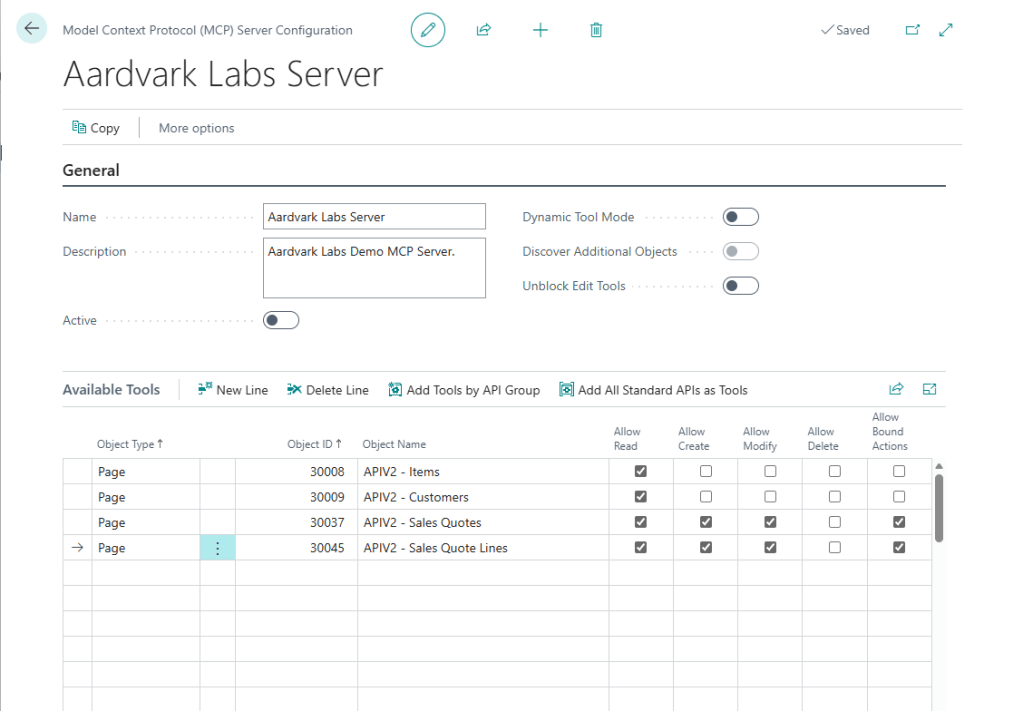 Note that we have selected that this MCP can only read Items and Customers. We want to be able to create Sales Quotes, so we have Sales Quotes and Sales Quote Lines with Read, Create, Modify and Bound Actions.