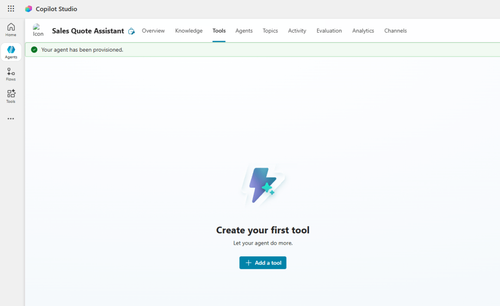 After that prompt is processed, we are going to need to add the MCP server as a tool. Click on the “Tools” header and click “Add a tool”.