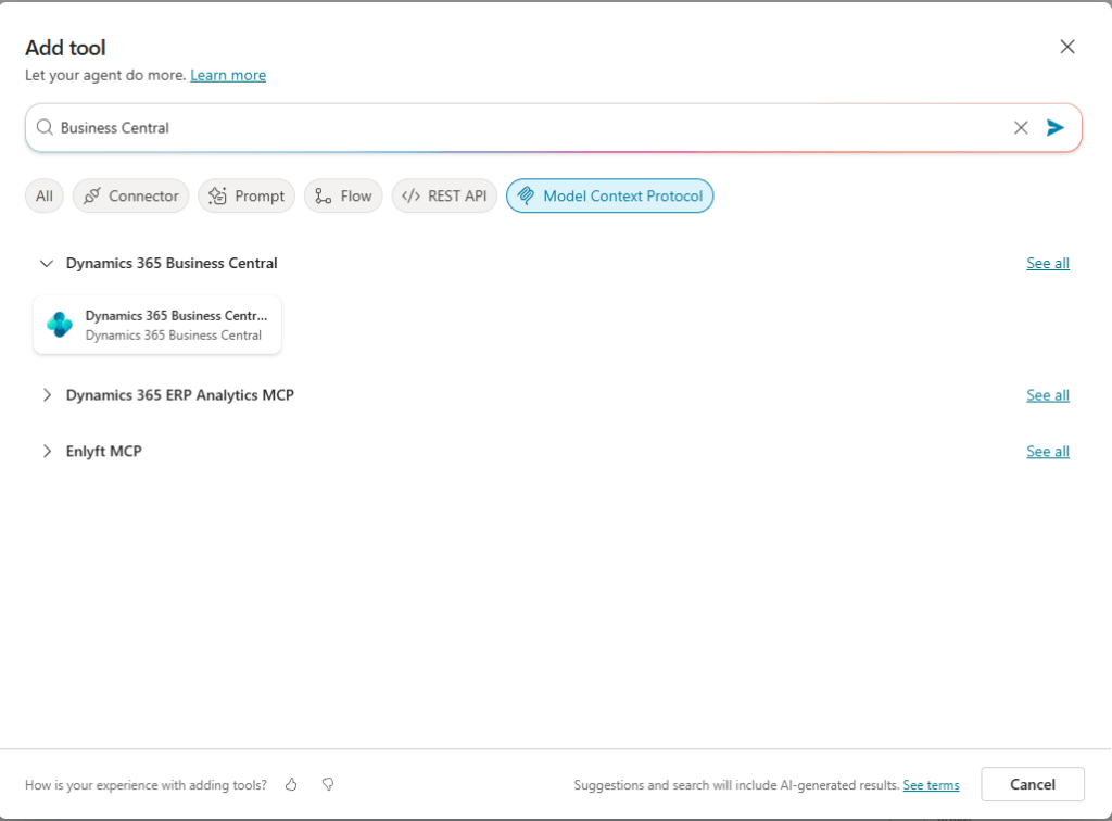 A quick search for “Business Central” displays a ready to use Dynamics 365 Business Central MCP tool.